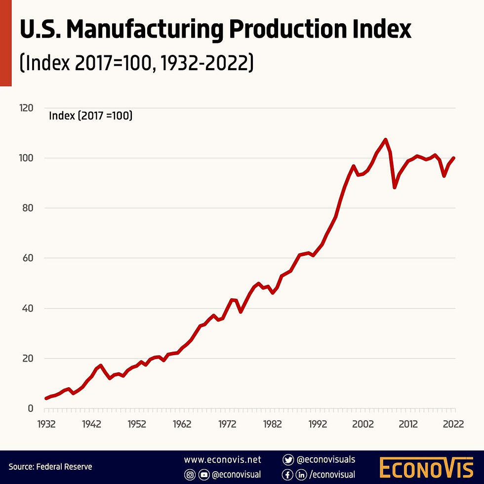 U.S. Manufacturing Production Index (Index 2017=100, 1932–2022)AdminSep 16, 20231 min readRated NaN out of 5 stars.#USA #manufacturing #industry #industrial #production #ValueAdded #GDP